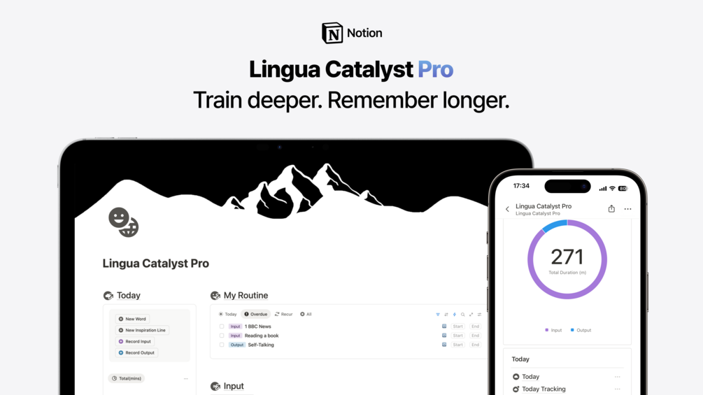 An all-in-one Notion system that makes language learning stick — with spaced repetition, smart review, and active output practice organized into 4 pages :